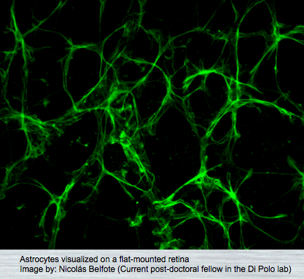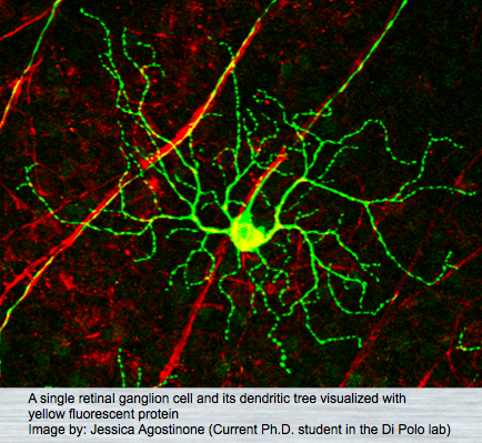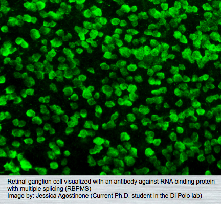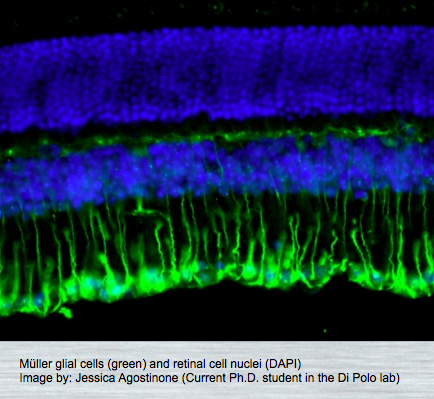 Dr. Adriana Di Polo’s laboratory focuses on the pathobiology of retinal ganglion cells, the neurons that convey visual information from the retina to the brain via their axons in the optic nerve. Loss of vision in glaucoma, the leading cause of irreversible blindness worldwide, is caused by the death of retinal ganglion cells. At present, there is no cure for glaucoma and current treatments are often insufficient to stop disease progression. We seek to understand the mechanisms underlying retinal ganglion cell death and to develop novel therapeutics to preserve and restore vision.